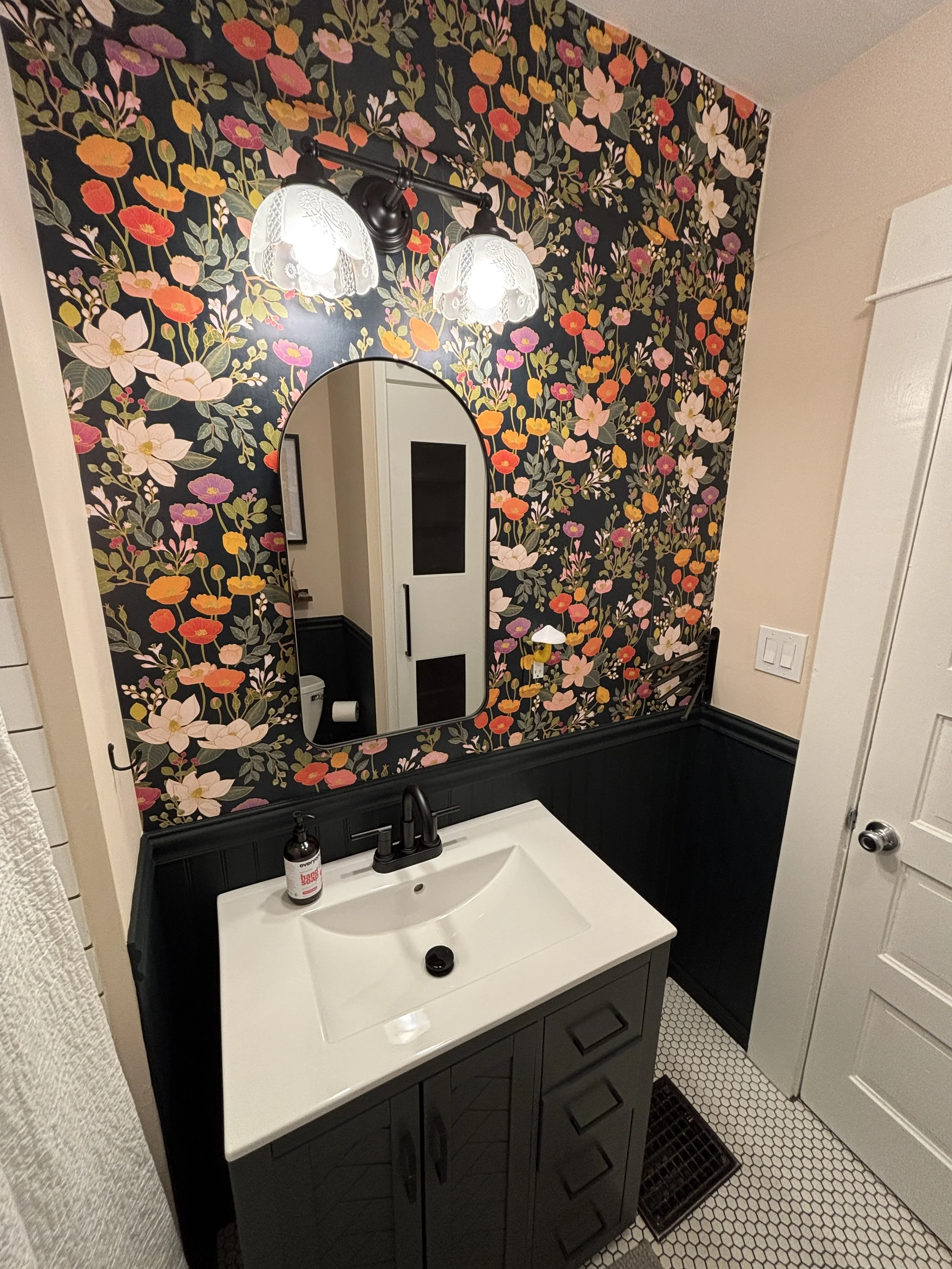 First, we started with the bathroom remodel. The clients are 6’2” and 5”4” and due to the awkward height of the old medicine cabinet, neither client could see their full face! They even hung a lower mirror below the medicine cabinet so that the wife and child could get ready in the morning. We started with moving the electrical, framed in a new medicine cabinet and got rid of the old sink vanity to allow for more counter space. Being a small bathroom, their biggest problem was the lack of wall space to keep their towels dry. In addition, the deep closet shelves needed a redo to allow for better organization. New paint, wallpaper and redesigned shelves made all of the difference to create this sessy bathroom.