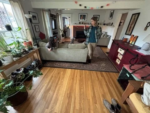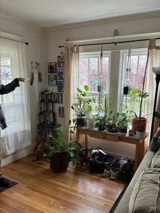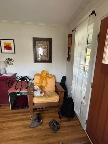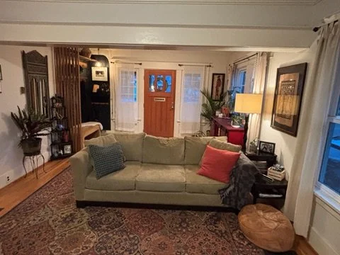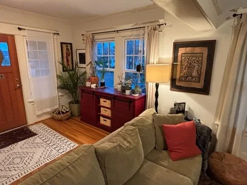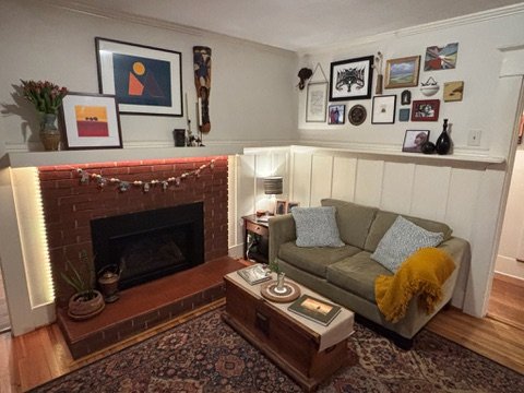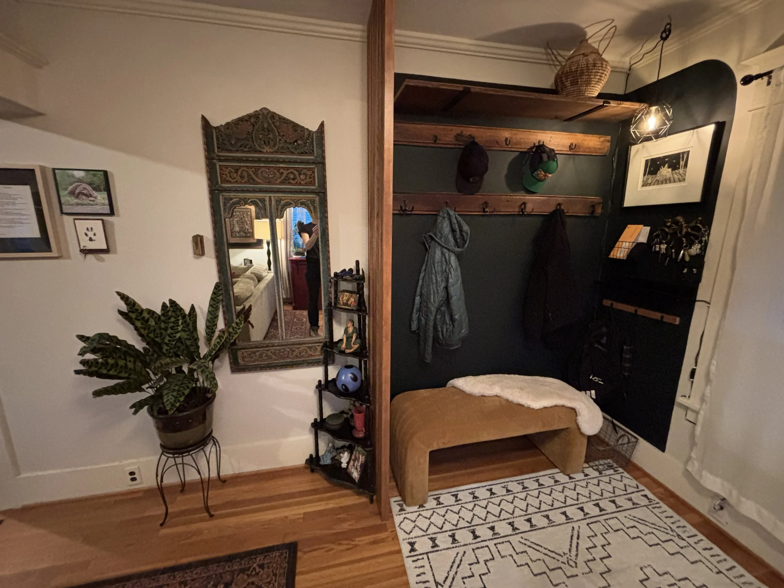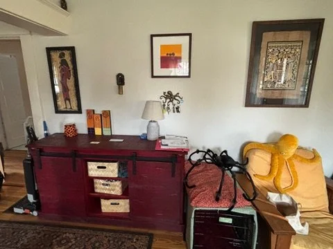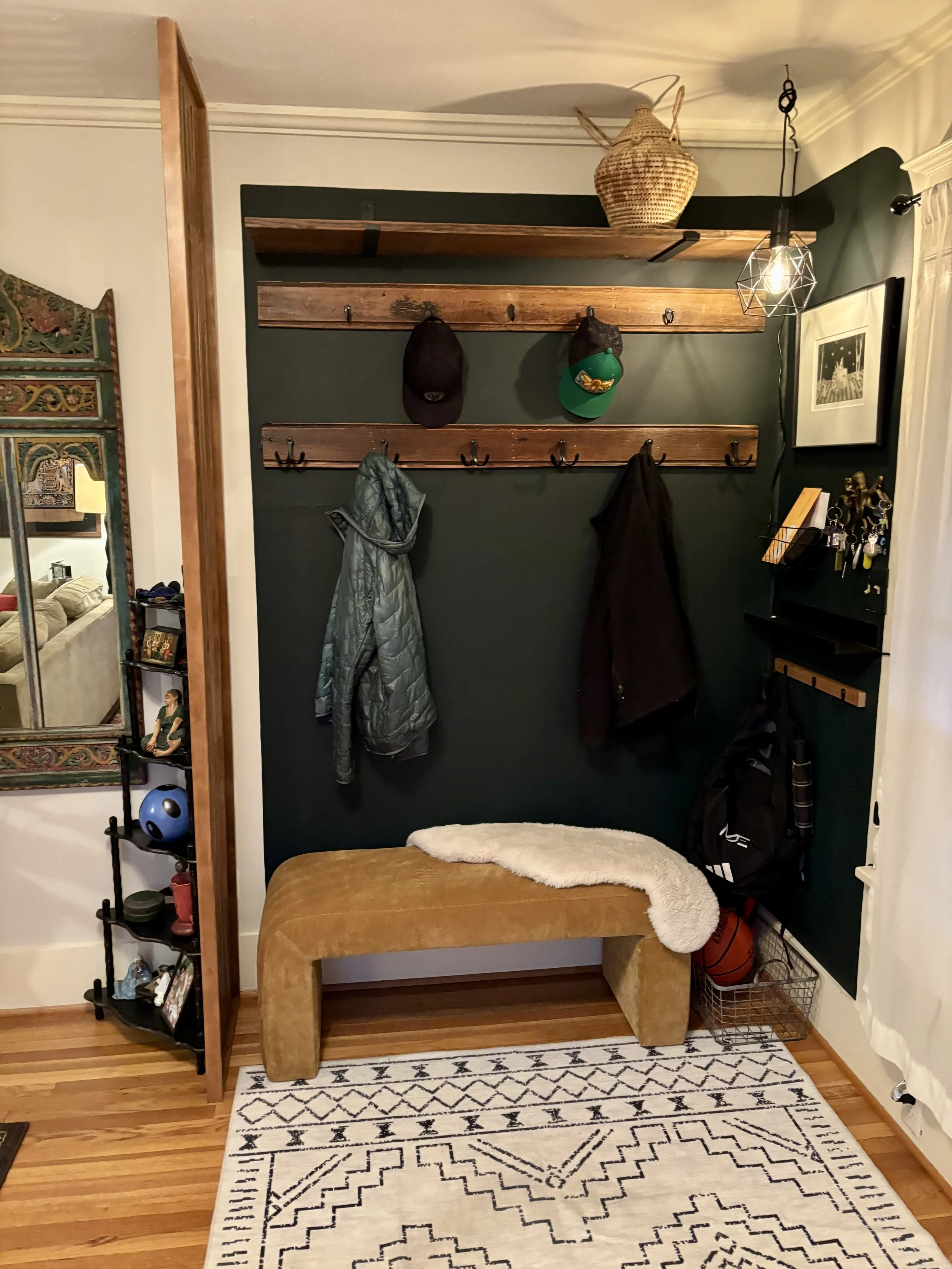 Next was the coat closet that has always been in their hallway directly outside of the bathroom. The proposed idea was to create an organized space for jackets and shoes closer to the front door. We built a wood slat divider, hung a shelf, new hooks, basket for mail and a cozy bench. TODS was extra excited to provide our DoOver service to the clients and redesign their living room. We added a few new items and revamped the space to show off their fabulous art. It turned out perfect and everyone was thrilled!
